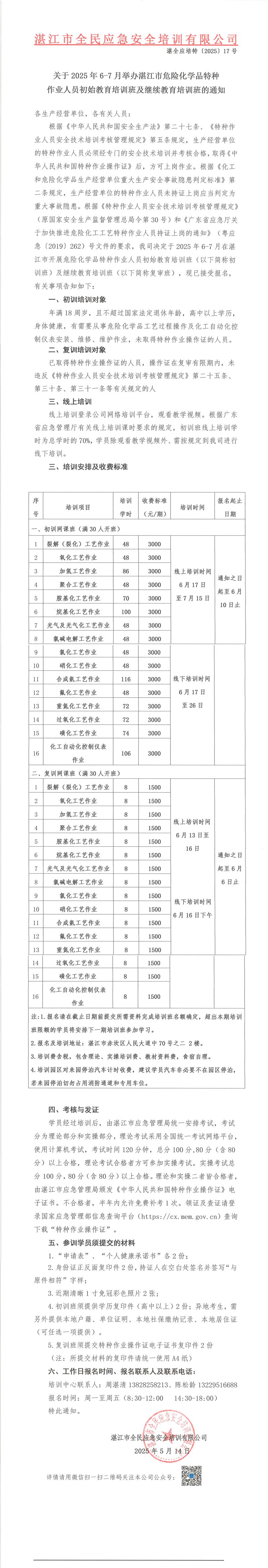 關(guān)于舉辦2025年6-7月份湛江市危險(xiǎn)化學(xué)品特種作業(yè)初訓(xùn)培訓(xùn)班的通知
